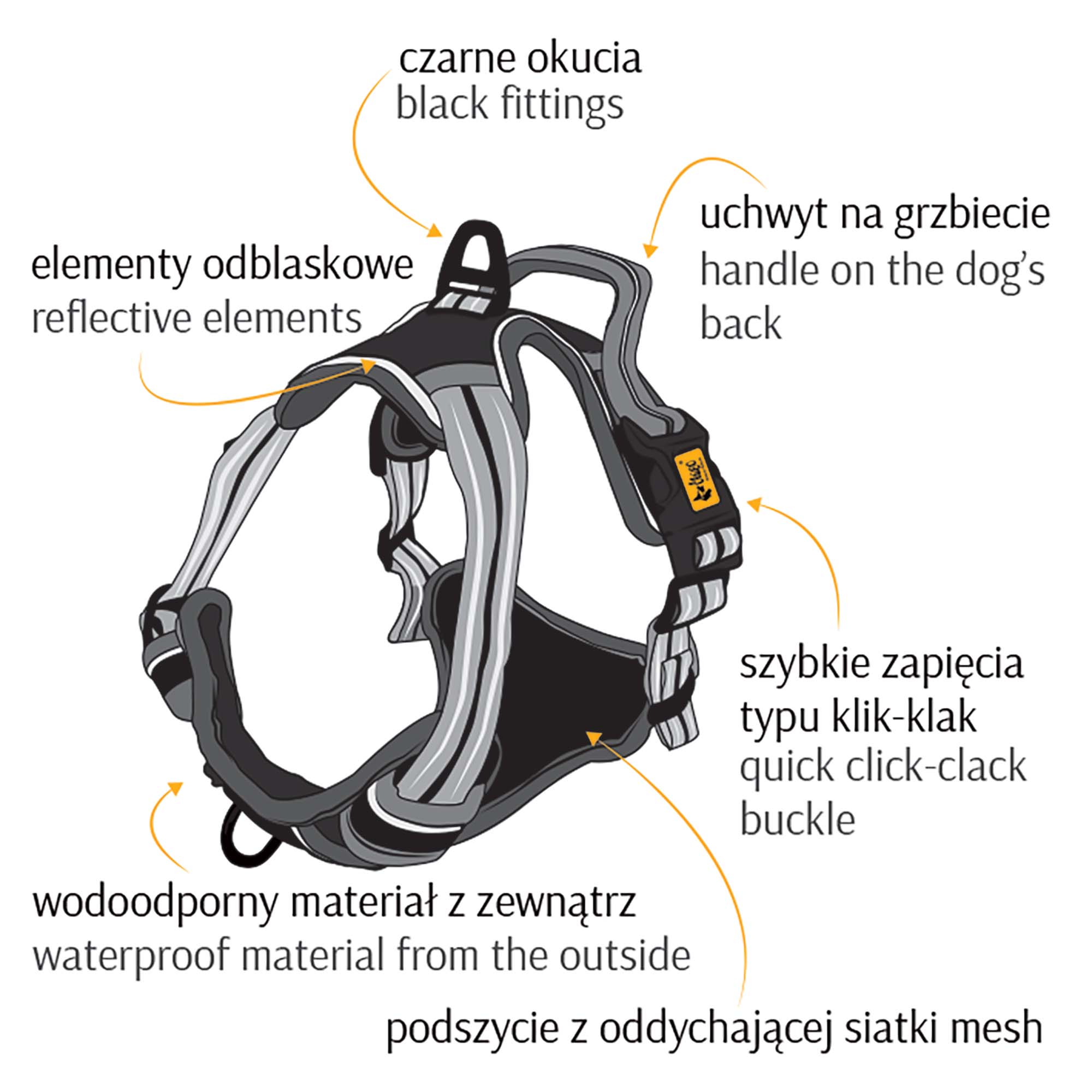 - posiadają dwa zapięcia do smyczy: jedno na plecach, a drugie typu easy-walk,