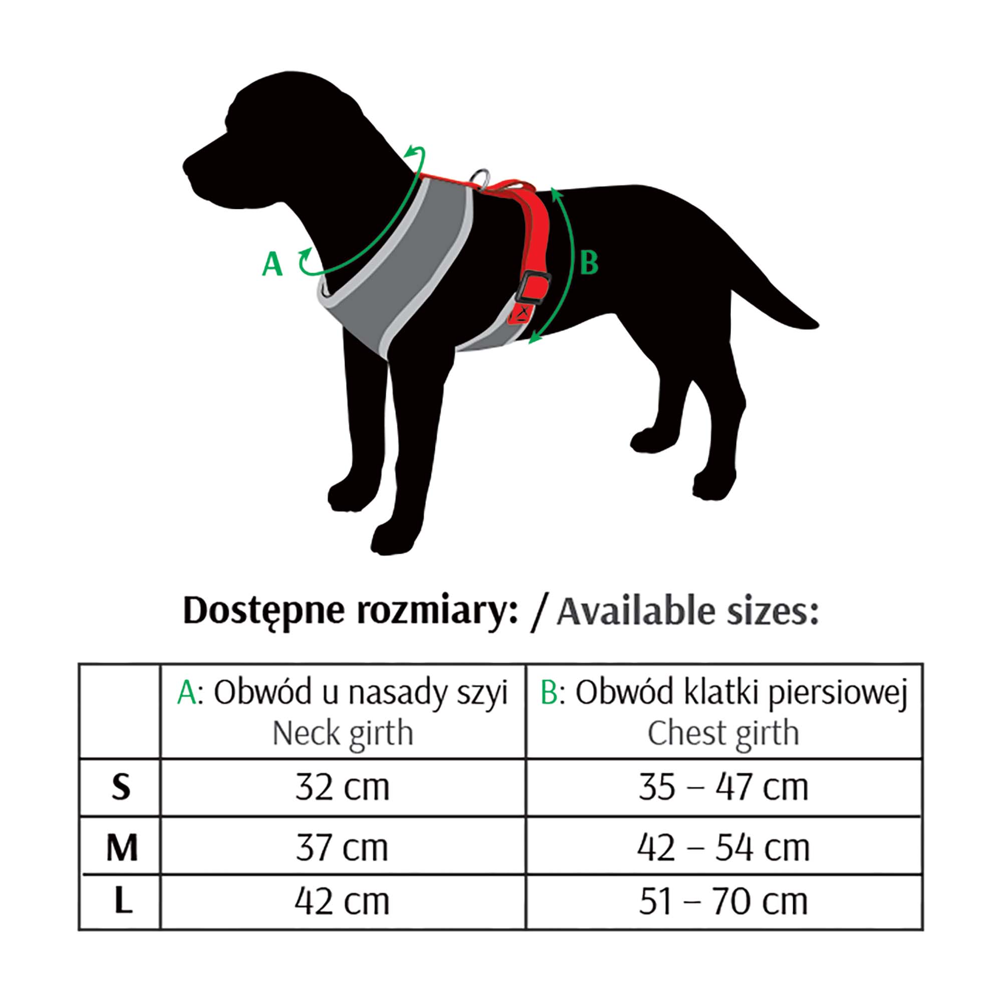 The adjustable non-restrictive harnesses for dogs are available in 3 sizes: