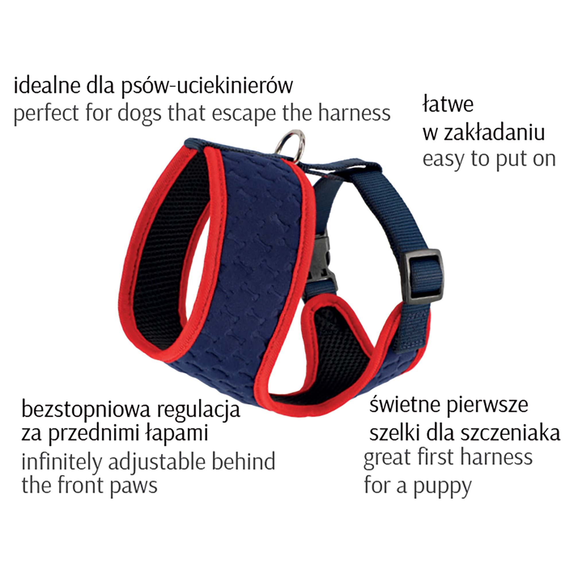 Characteristics of the adjustable non-restrictive harnesses for dogs: Perfect for escape artist dogs Adjusted behind the front legs Non-restrictive Doesn't restrict the dog's movements and doesn't rub Lightweight and breathable Machine washable Quick-drying Continuously adjustable to perfectly fit any dog's body structure Ideal for small and medium-sized dogs Quick and easy to put on (slipped over the head and fastened with a convenient click-clack buckle)