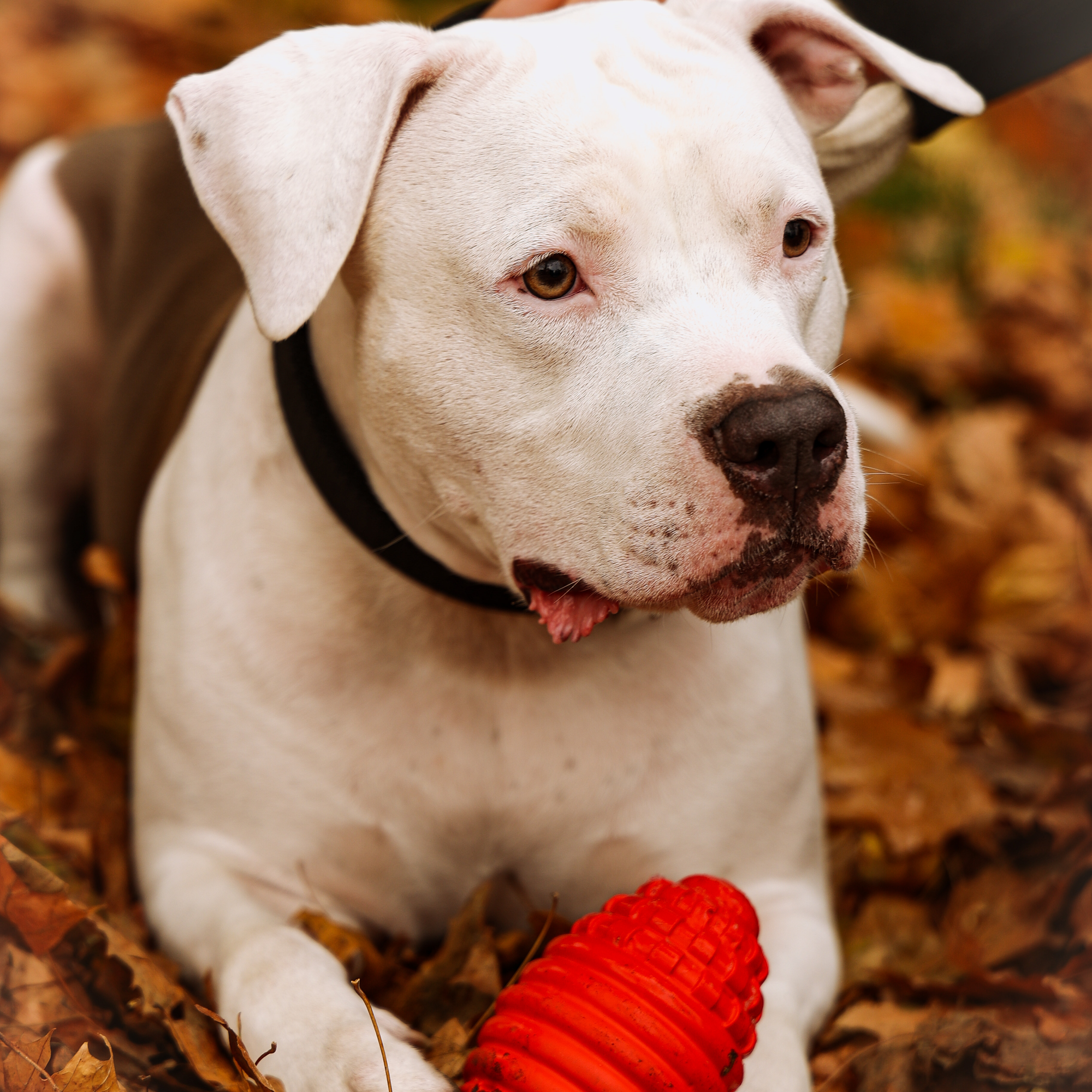 The rubber, ribbed surface of the ball makes it very attractive to the dog and massages its gums while chewing.